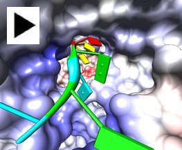 Interactive shadows (shadows that move as structures are moved) can be enabled in the Effects dialog or with the command set shadows. Click the image to show a small molecule rotating above a rectangular plane. This simple animation was made with the Chimera command script tumble.com. Interactive shadows also work with ribbons, surfaces, and other representations.