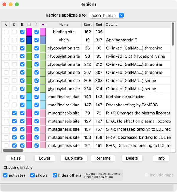 Regions applicable to the entire alignment or to any of the individual sequences in the alignment can be listed using the pulldown menu near the top of the dialog. Regions applicable to the entire alignment include the ChimeraX selection and any hand-drawn regions, even if they only enclose parts of a single sequence. Regions applicable to an individual sequence include UniProt sequence features and regions created by structure association.