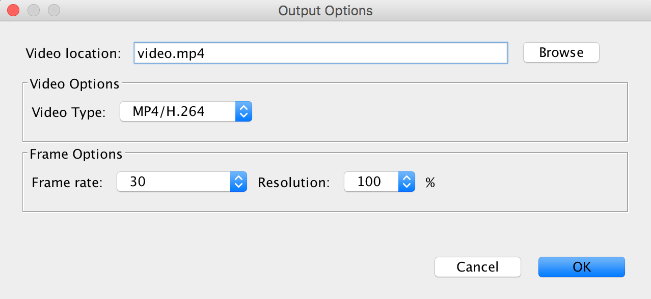 Figure 3. The Output Options Dialog showing the production of an H.264 video file at the screen resolution and 30 frames/second.
