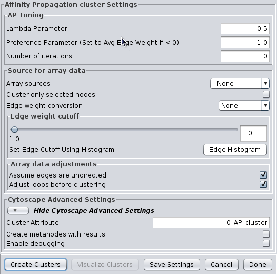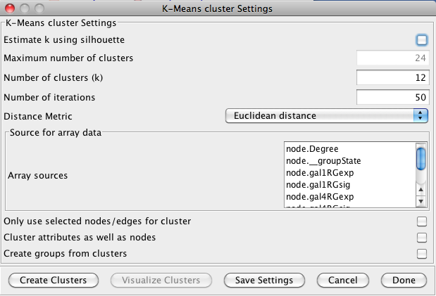 Once clusterMaker is installed, it will install a new Cluster menu hierarchy under the Plugins main menu. Each of the supported clustering algorithms appears as a separate menu item underneath the Cluster menu. To cluster your data, simply select Plugins→Cluster→algorithm where algorithm is the clustering algorithm you wish to use (see Figure 2). This will bring up the settings dialog for the selected algorithm (see below).