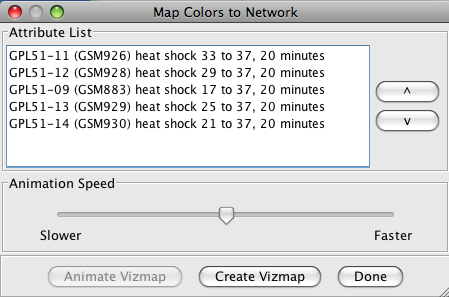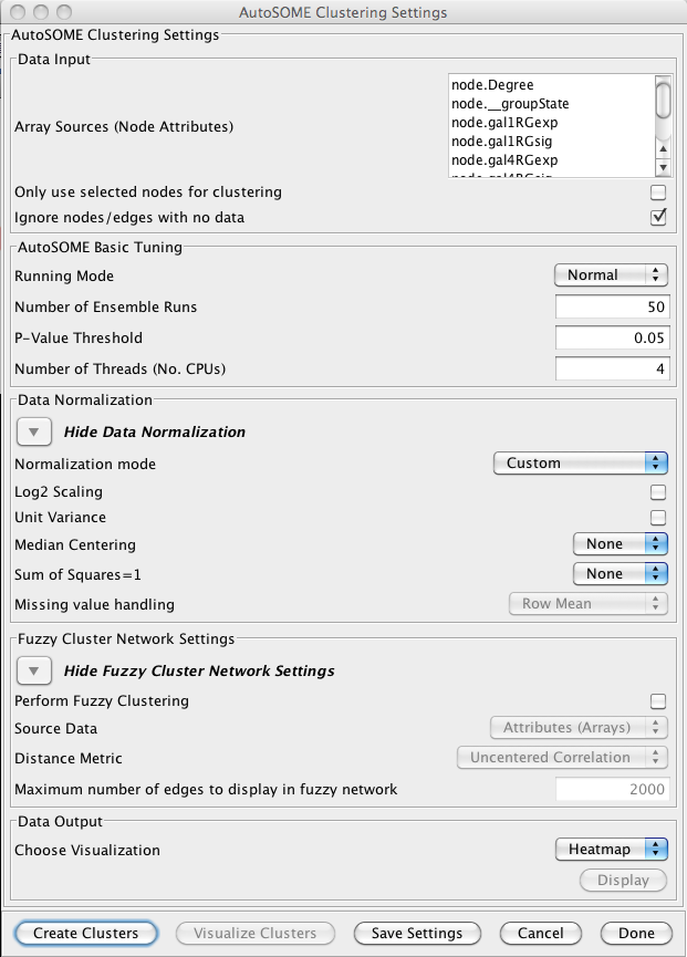 The Cluster menu also contains a subset of the visualization options, including showing a heat map of the data (without clustering), and options appropriate for displaying Hierarchical or k-Means clusters if either of those methods had been performed on the current network. Because information about clusters is saved in Cytoscape attributes, the Eisen TreeView and Eisen KnnView options will be available in a session that was saved after clustering.