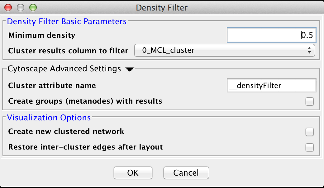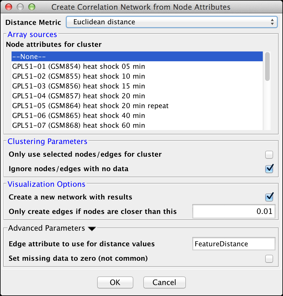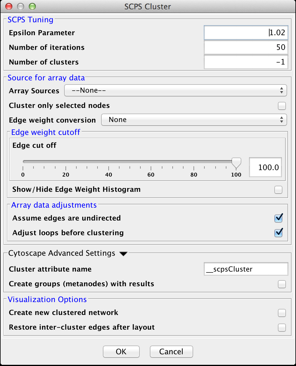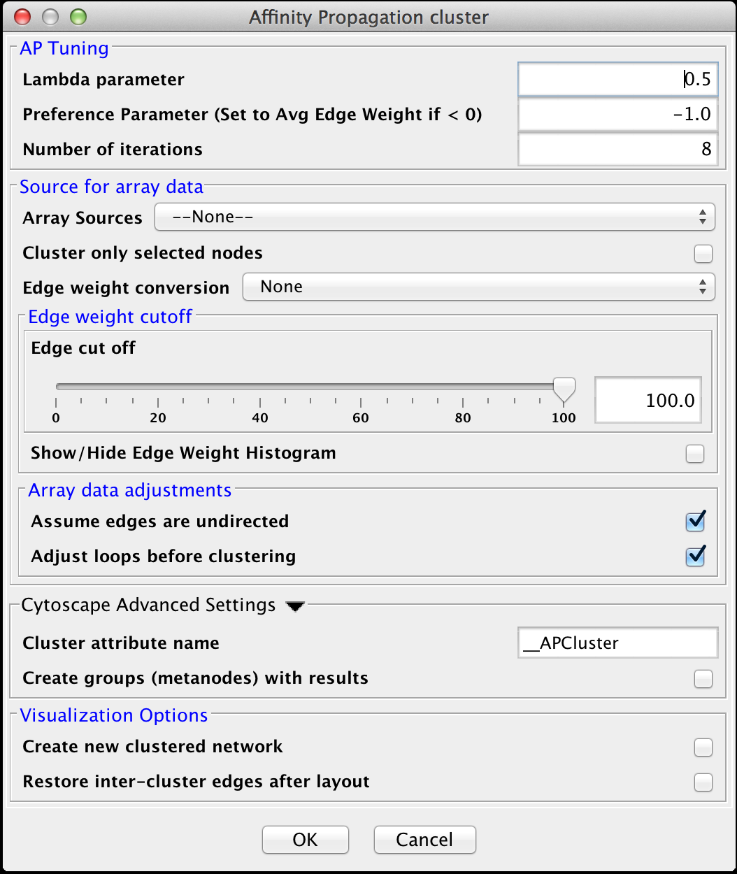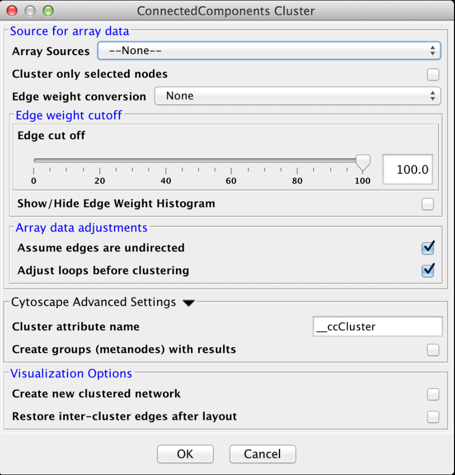 : Select the edge table column to be used for calculating the cluster. Only one column may be chosen. Also note that you may either choose Node attributes or an Edge column, but not both. - ignoreMissing=true|false: Ignore any nodes that have missing data. If this is not selected, missing values will be set to 0.