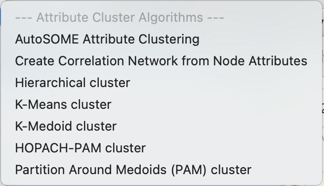 - Attribute Cluster Algorithms: a list of node attributes or a single edge attribute is chosen to perform the clustering. The normal visualization is some kind of heat map where the rows correspond to the nodes in the network. Selection of a row selects the corresponding node in the network. If an edge attribute is chosen, the columns also correspond to the nodes in the network and selection of cell in the heat map selects an edge in the network.