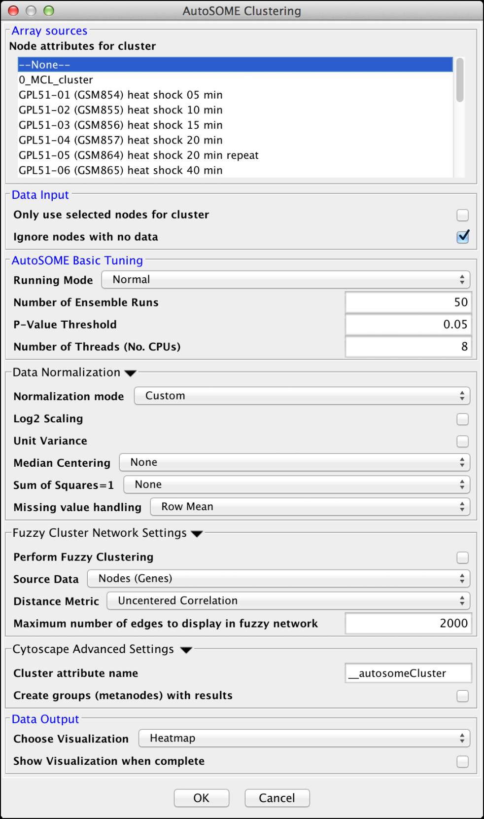 Each of the supported clustering algorithm appears as a separate menu item underneath the clusterMaker menu. To cluster your data, simply select Apps→clusterMaker→algorithm, where algorithm is the clustering algorithm you wish to use. This will bring up the settings dialog for the selected algorithm.