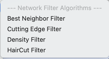 - Network Filter Algorithms: these are designed to be executed after a Network Cluster Algorithm has been run to refine the resulting partitioning.