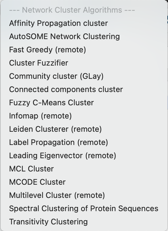 Once clusterMaker2 is installed, it will install four menu hierarchies under the Apps main menu: clusterMaker Cluster Attributes (Figure 2), clusterMaker Dimensionality Reduction (Figure 4), clusterMaker Filter Clusters (Figure 5), clusterMaker Ranking (Figure 6) and clusterMaker Visualizations (Figure 7).