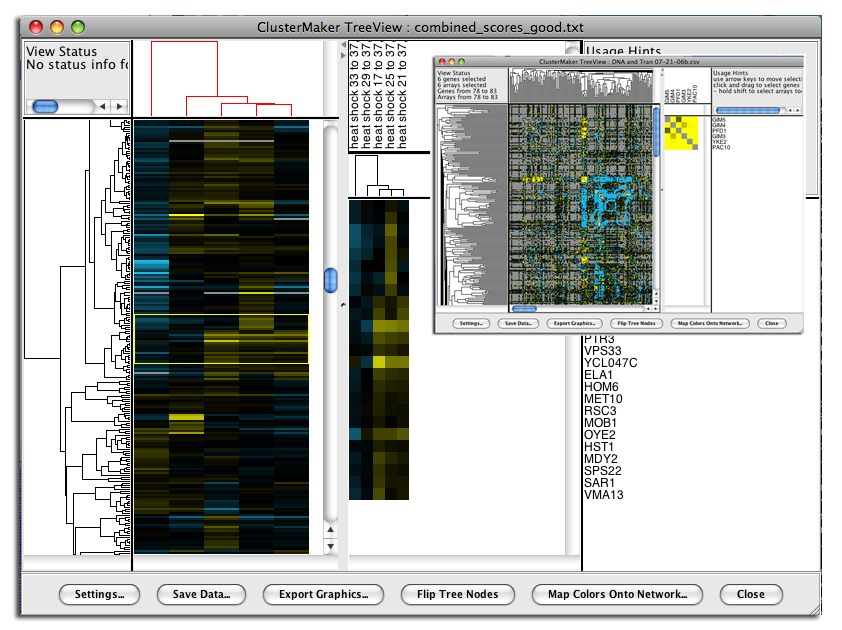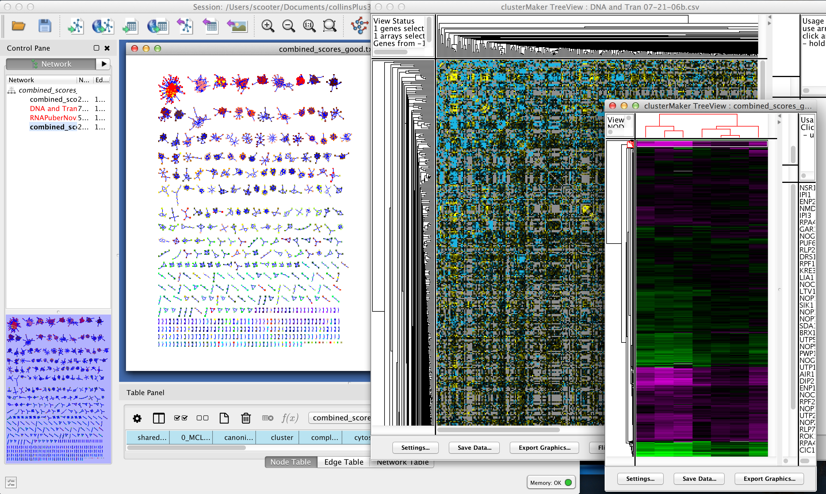 Figure 1. clusterMaker2 in action. In this screenshot, the yeast protein-protein interaction network from Collins, et al. (2007a) has been clustered using MCL. A yeast expression data set from Gasch, et al. has been imported into the PPI data, and a yeast genetic interaction dataset from Collins, et al. (2007b) has been imported as a separate network. All of the networks share node identifiers so they may be linked. The genetic interaction network and the expression data set are shown as heatmaps.