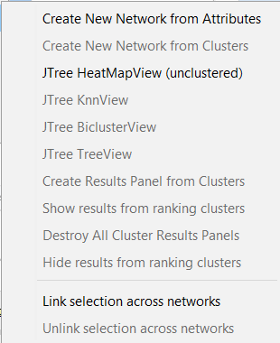 The clusterMaker Visualization menu contains the visualization options, including showing a heat map of the data (without clustering), and options appropriate for displaying Hierarchical or k-Means clusters if either of those methods had been performed on the current network. Because information about clusters is saved in Cytoscape attributes, the JTree TreeView and JTree KnnView options will be available in a session that was saved after clustering.