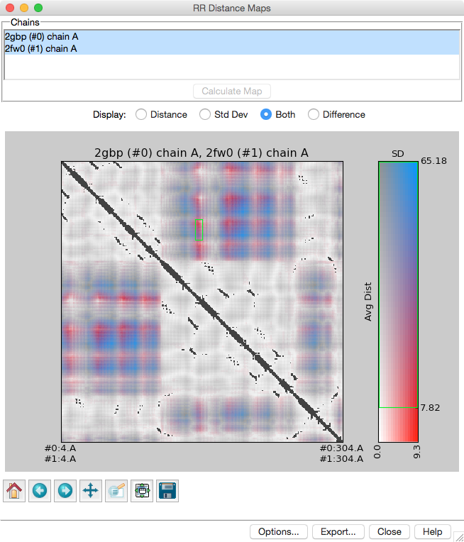 Individual chains or blocks of chains can be chosen from the Chains list with the left mouse button. Ctrl-click toggles the status of an individual chain. Only protein chains containing α-carbons will be handled. If a single chain is chosen, an individual distance map will be generated. If multiple chains are chosen, they must have sequences similar enough to be aligned. The sequences will be aligned to obtain residue equivalences, and distance differences (if two chains), means, and standard deviations will be calculated for equivalenced residue pairs.