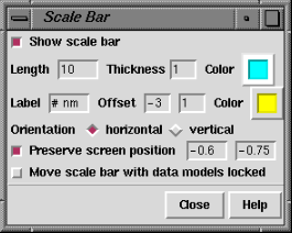 Of course, changing the depth cueing, moving the clipping planes, or turning off perspective will also affect the appearance of the displayed data, whereas moving only the scale bar will not. When Move scale bar... is on, the scale bar can be Z-translated (moved closer or farther away) with the mouse or with the command move.