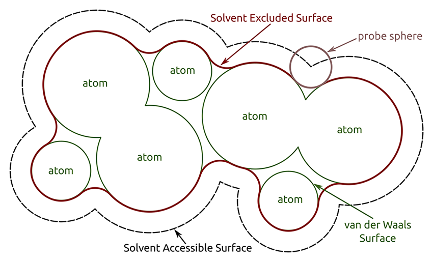 Analytical solvent-excluded and solvent-accessible surface areas per atom and residue are assigned as attributes named areaSES and areaSAS, respectively. These may include contributions from more than one component. For example, one side of an atom could form part of an interior cavity while the other side could form part of the exterior surface. Calculating relative exposure (a normalized surface area) may be helpful for classifying amino acid residues as buried or exposed.