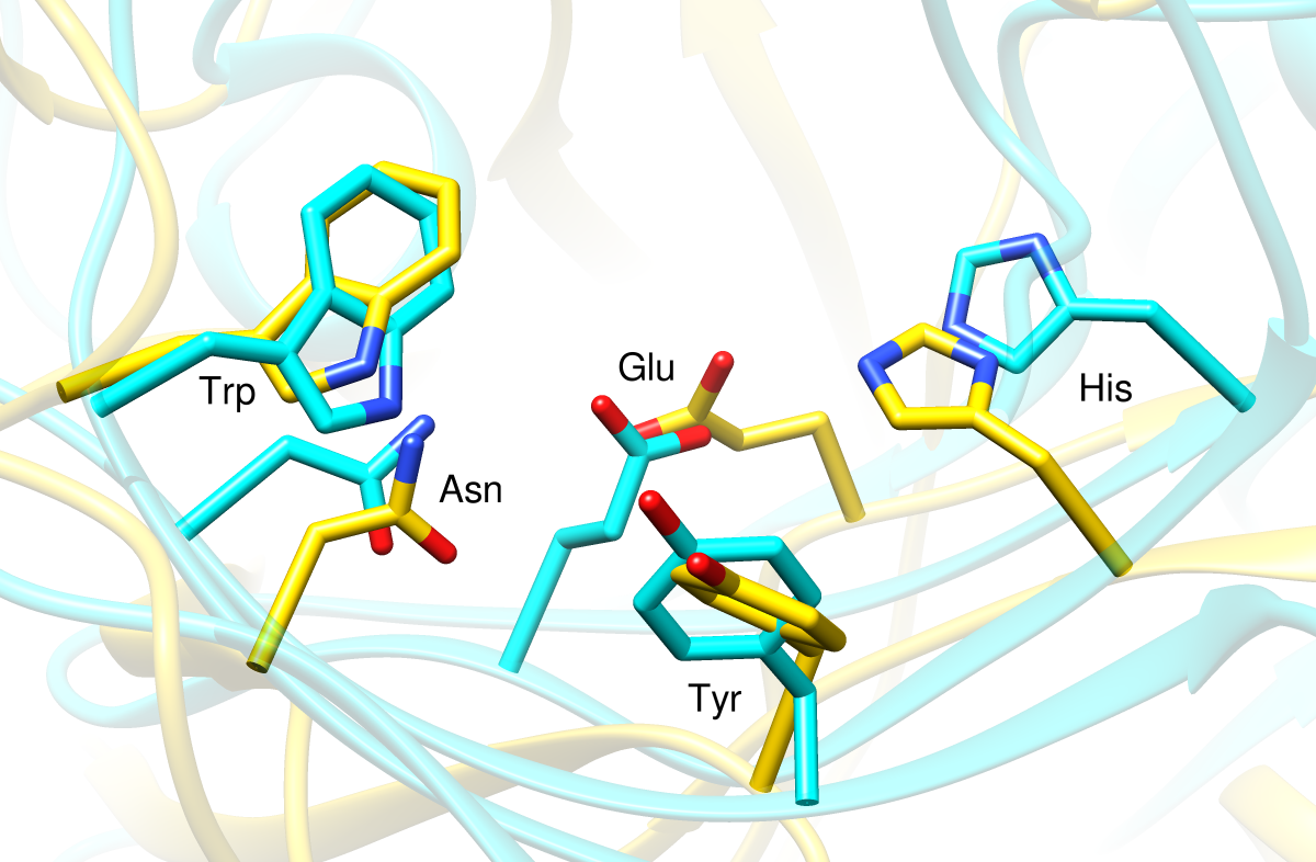 β-1,4-glycanase (gold, Protein Data Bank entry 1exp) and cellobiohydrolase I (cyan, Protein Data Bank entry 1cel) have different folds but a similar pattern of amino acids near a glucose residue. This possible example of convergent evolution was identifed in Table 5 of:
