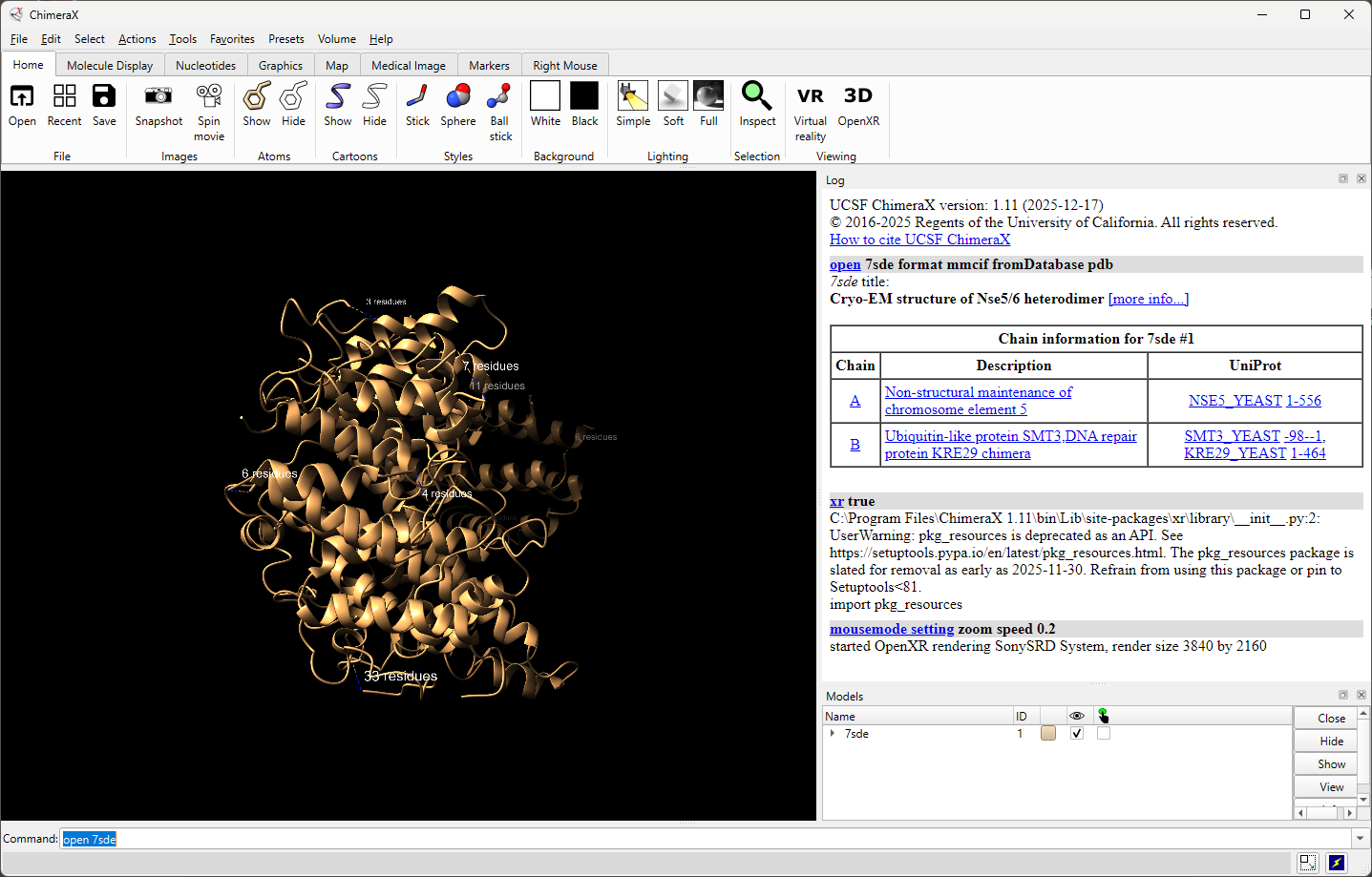 PDB 7sde shown on Sony SR1 15" display, initial appearance is zoomed correctly in unmodified ChimeraX 1.11.