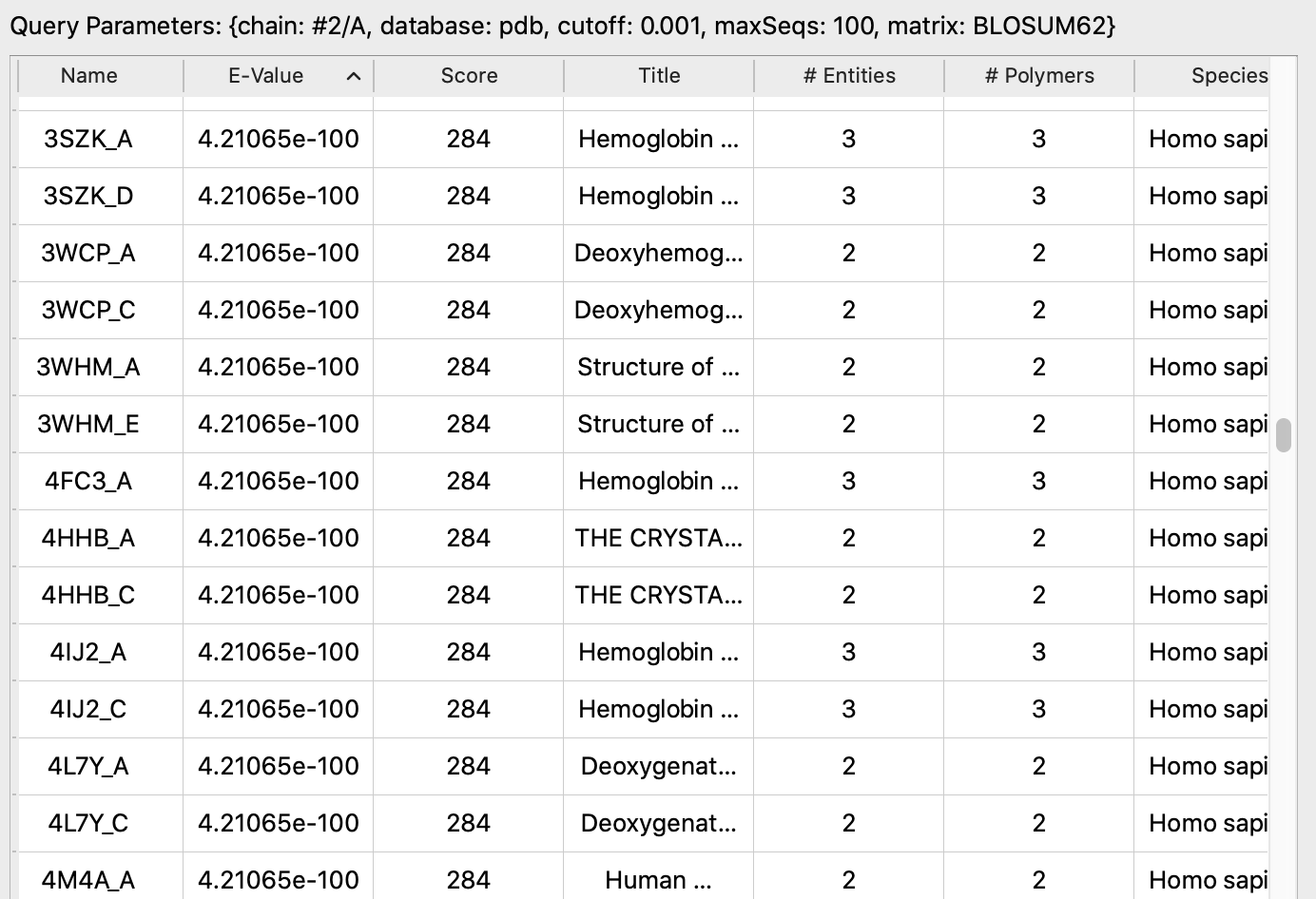 blast results screenshot showing entities = polymers