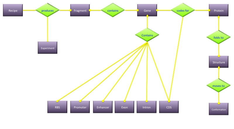 Put together an ER diagram for a database system for cellular pathways. Include information