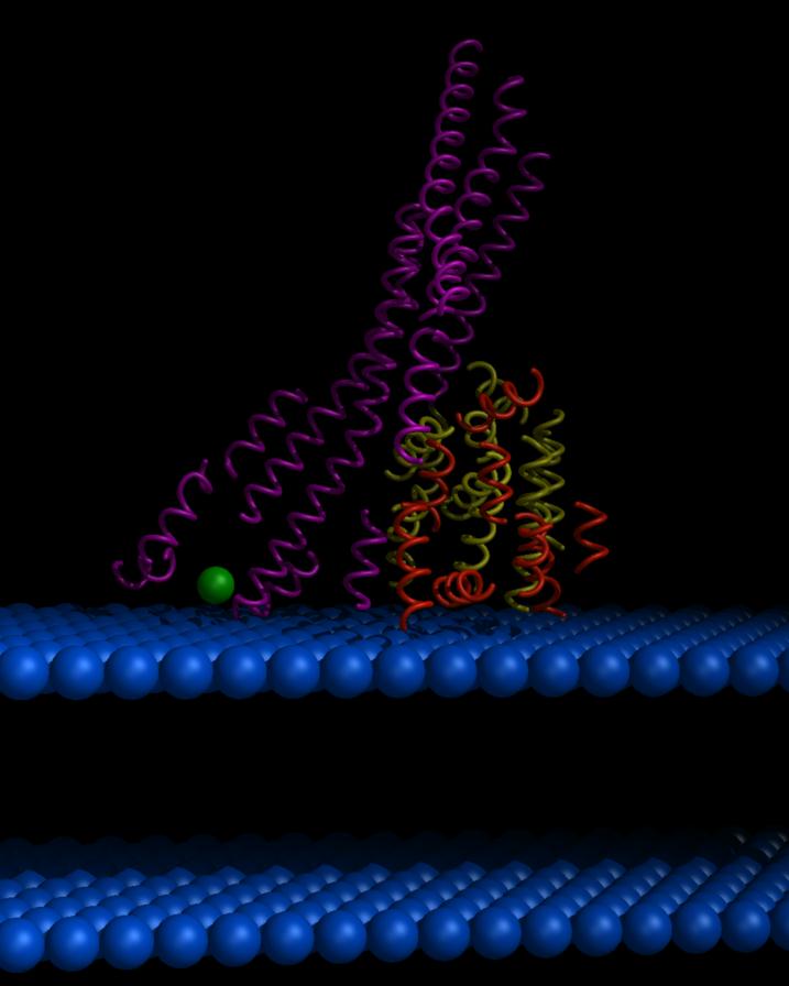 This image shows a model of Colicin Ia as it may associate with a bilayer membrane prior to insertion into the bilayer. The blue surface represents the phospholipid head groups at the surface of the inner bacterial membrane. The green sphere indicates a site know to be closely associated to the membrane via experimentation. The 10 alpha-helix sub-domain of the Insertion Domain is shown in yellow and the 8 alpha-helix sub-domain of the Insertion Domain in orange. The Attachment Domain as well as the Bridging Domain are shown in red.
