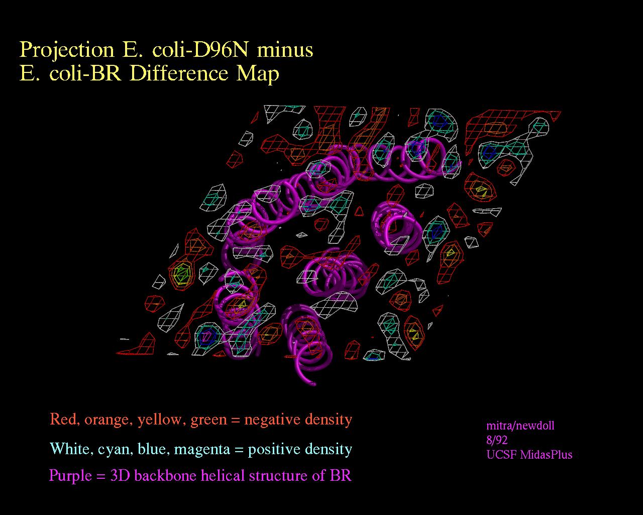 The different colors for the density were achieved by opening several contour levels, each as a separate model number in MidasPlus. These contour levels can be displayed using the "density" delegate in MidasPlus, from XPLOR maps.