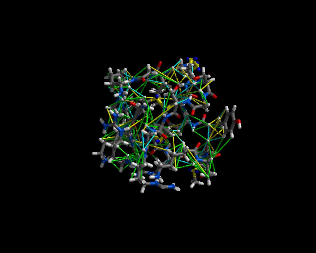 This image shows the structure of omega-conotoxin MVIIC, a small peptide found in the venom of the sea-snail Conus magus, along with the NMR constraints used to determine that structure. The structure is color-coded by atom type (via the color byatom command in MidasPlus) and the constraints (thinner tubes) are colored in the following schema: