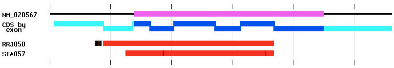 Figure 1: Image showing alignment of two BayGenomics cell line sequence tags RRJ050 and STA057 to the gene NM_020567. Ticks represent intervals of 200 bases. The coding region of this gene is shown on the top line in magenta with the horizontal black line denoting the length of the gene in the alignment. The coding strand (CDS) representation is shown in blue with the predicted exon boundaries delineated by the offsets. The cyan regions show genomic sequence outside of the CDS, such as 5' and 3' untranslated regions. The sequence tags are shown in red. The vertical black lines on the sequence tags denote mismatches in the alignment between the gene and the sequence tag sequences.