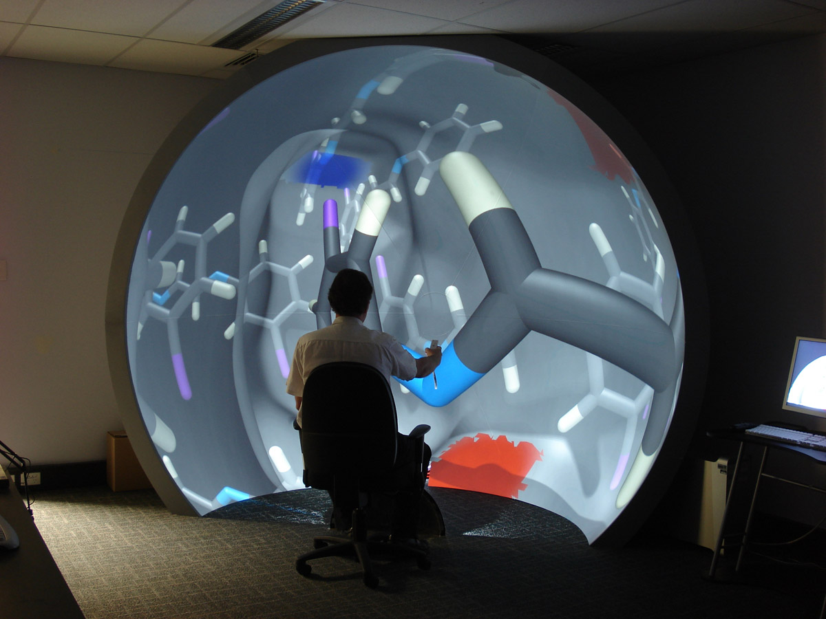 At the request of our collaborators at National Center for Macromolecular Imaging (NCMI), we have added preliminary support for generating images that are suitable for projecting with a fisheye lens on the inside of a dome. The advantage of projecting on a dome is that the image fills the periphery of the field of view and thus provides context to what is being visualized. And in the case of macromolecular assemblies, context helps the viewer understand the relationships between the various parts of the assembly. The ultimate goal is to produce an animation suitable for projecting in a planetarium, but this may also be useful for interactive use by a single researcher in a minidome.