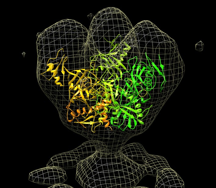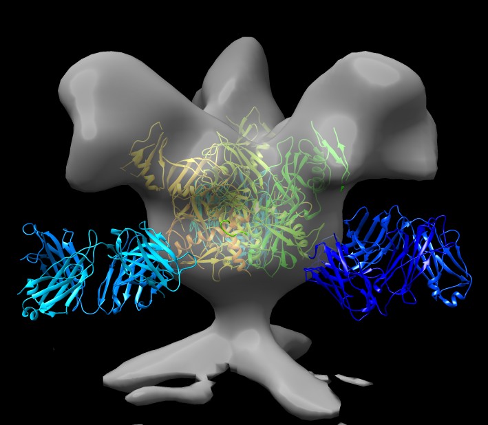 Find ebola glycoprotein on pdb web site, 3csy, open in Chimera, hide atoms, delete extra 1/3 of a trimer, hide antibodies (~ribbon :.A-H), fit into EM map 6003 (need to select just glycrotein, not antibodies, drag select). |