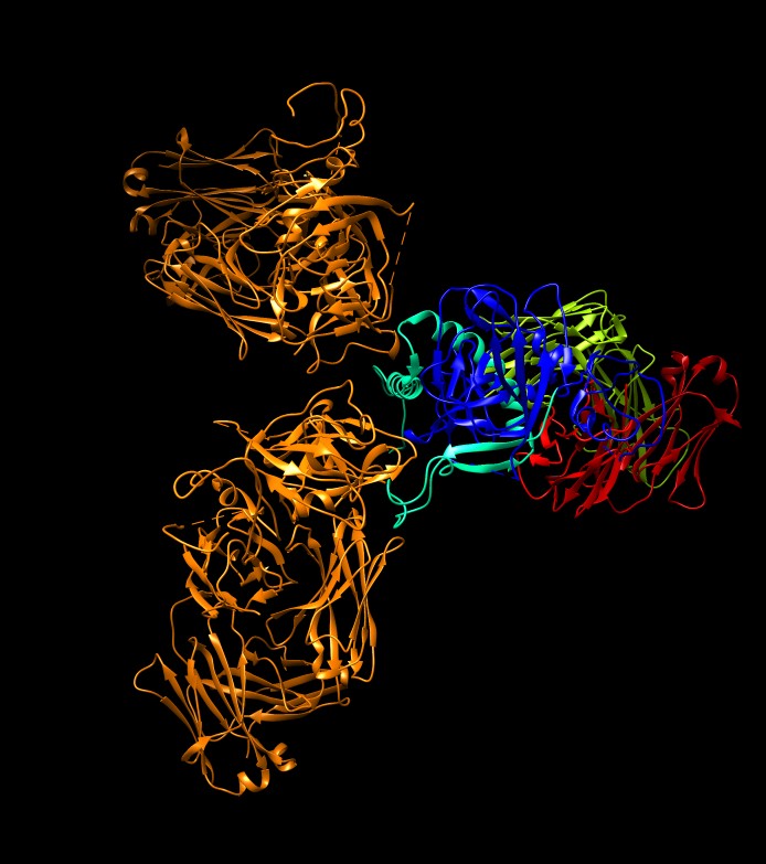 Would want an antibody that targets for example the nearby all red helix, conserved across strains. ZMapp drug used experimentally on a few Ebola victims is a mix of 3 antibodies (c13C6+c2G4+c4G7) against Ebola glycoprotein.