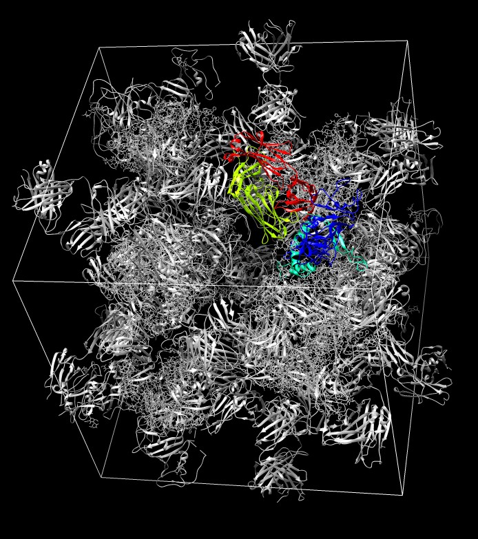 Unit cell is 195 Angstroms on a side according to dialog, approx 20 nm, so 50,000 copies of this brick along each axis make a millimeter size crystal for x-ray diffraction. Mouse over to see #7 and #11 make trimer with original copy, "color orange #7,11". |