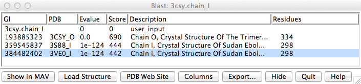 Are there other Ebolo glycoprotein structures that have the mucin-like domain? Use Chimera BLAST search of PDB to find similar sequences, chain I is glycoprotein.