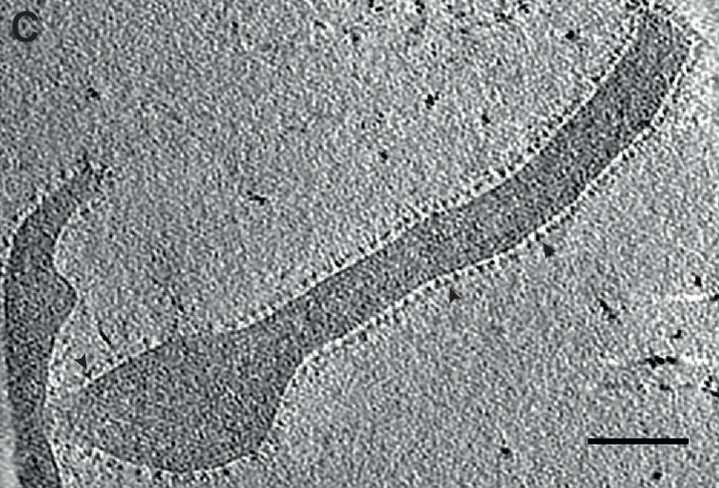 Electron microscopy of virus-like particles showing Ebola spikes, from Spatial Localization of the Ebola Virus Glycoprotein Mucin-Like Domain Determined by Cryo-Electron Tomography, July 2014.
