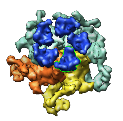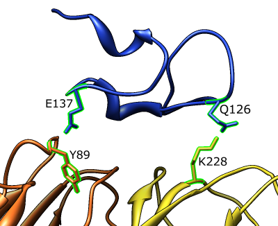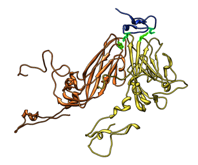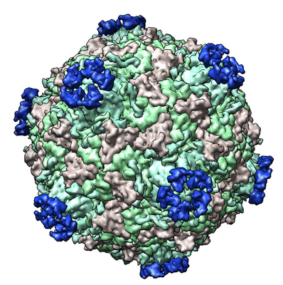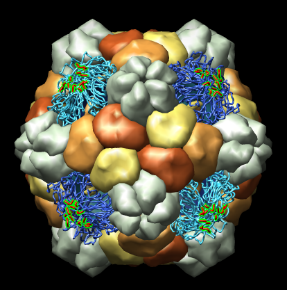 Rhinovirus with fragment of cellular receptor (blue) (PDB 1v9u). Exploring contacts between receptor and virus.
