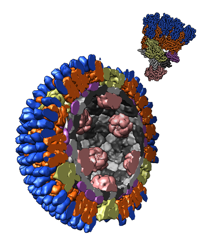 Atomic model of orthoreovirus (PDB 2cse) cut in half with one icosahedral asymmetric unit shown at upper right.
