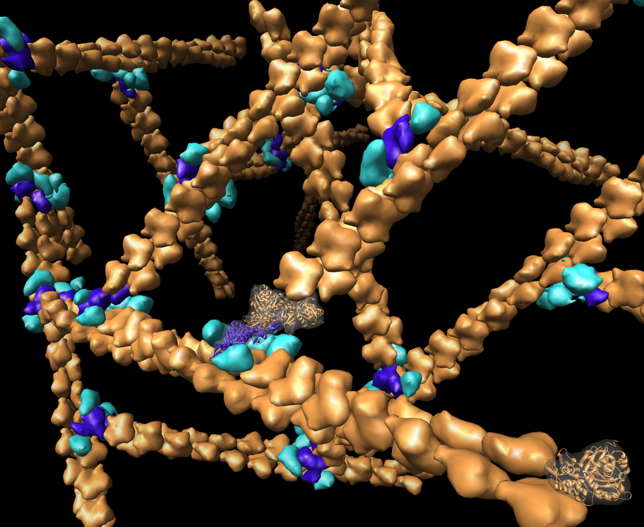 Branching actin filaments. Action monomers in orange. ARP2/3 branching complex in light and dark blue. (monomer PDB 1atn, ARP2/3 PDB 1k8k, filament PDB 1alm). Branching created by computational model, not from experimental data.