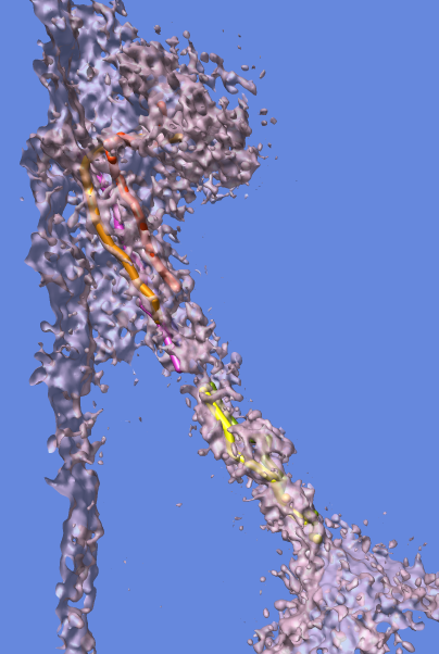 Measuring lengths of spines on neuron dendrite using hand-placed markers. IMOD segmentation of confocal microscopy data from Maryanne Martone. Forked and irregular spine shapes. Random spine colors to distinguish neighbors.
