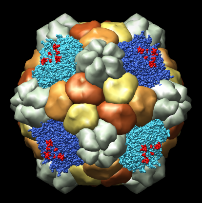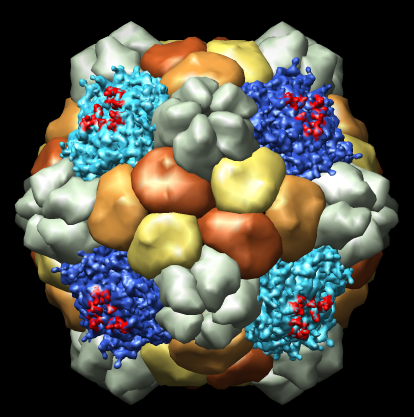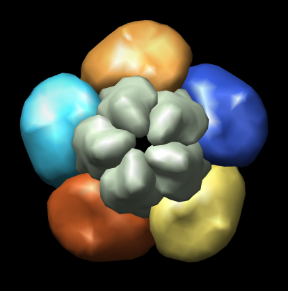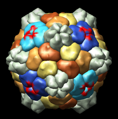 Figure 1: Colored trimeric proteins by crystal symmetry class. Each monomer in the 5-fold axis turret is in a different crystal symmetry class but is given the same color since they are not involved in crystal contacts. Note that under icosahedral symmetry every monomer is identical. | Figure 2: Noncrystallographic symmetric unit. |
