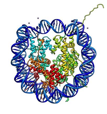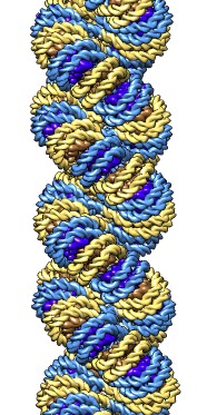 DNA in cells is wrapped around a spool (PDB 1AOI) called a nucleosome.
