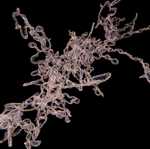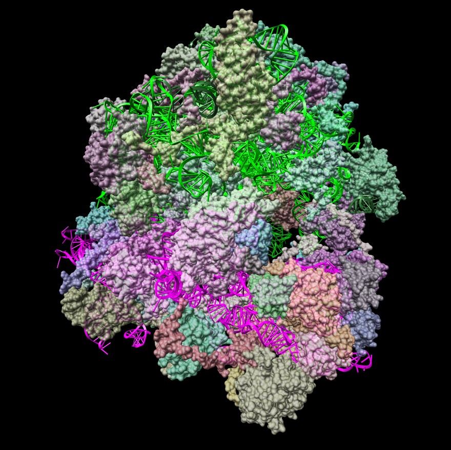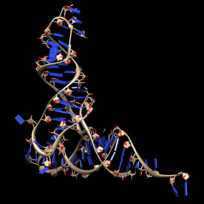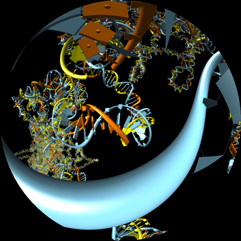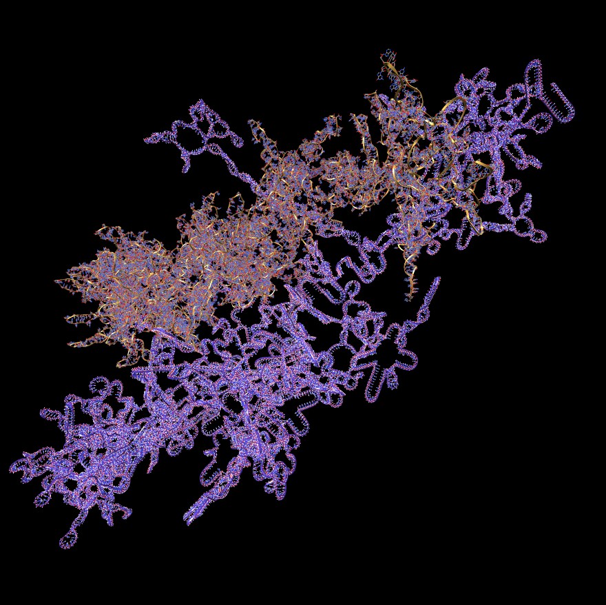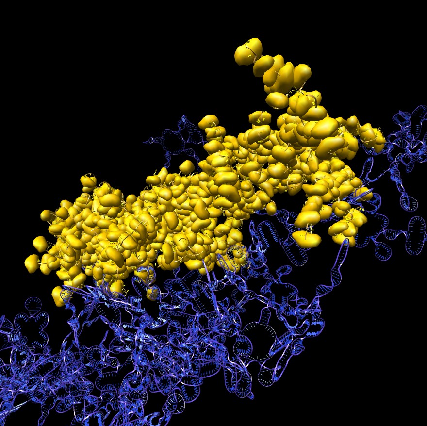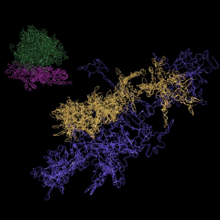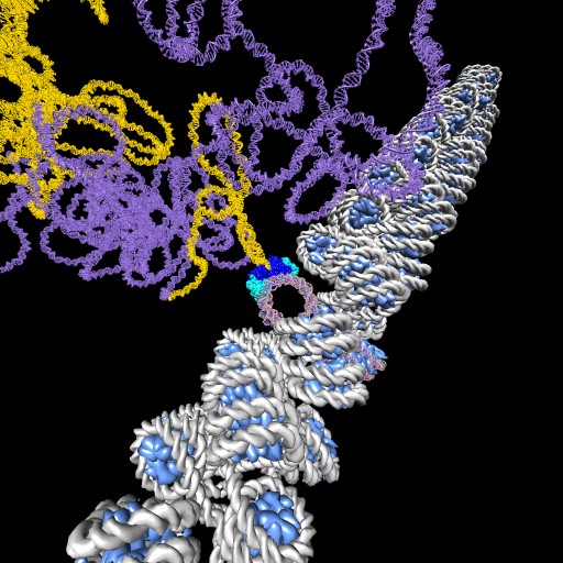 | Ribosome RNA decorated with 75 different proteins. (3u5c, 3u5e). Clips P, | HIV RNA decorated with ~1000 copies of nucleocapsid protein. Clips P, | Close-up of nucleocapsid binding (1a1t). Clips P. | Dimerization kissing hairpin (2d1b). Clips P. | Extended dimerization (2d1a) promoted by NC. Clips P. |