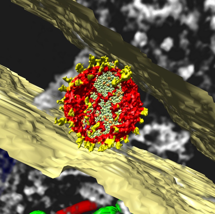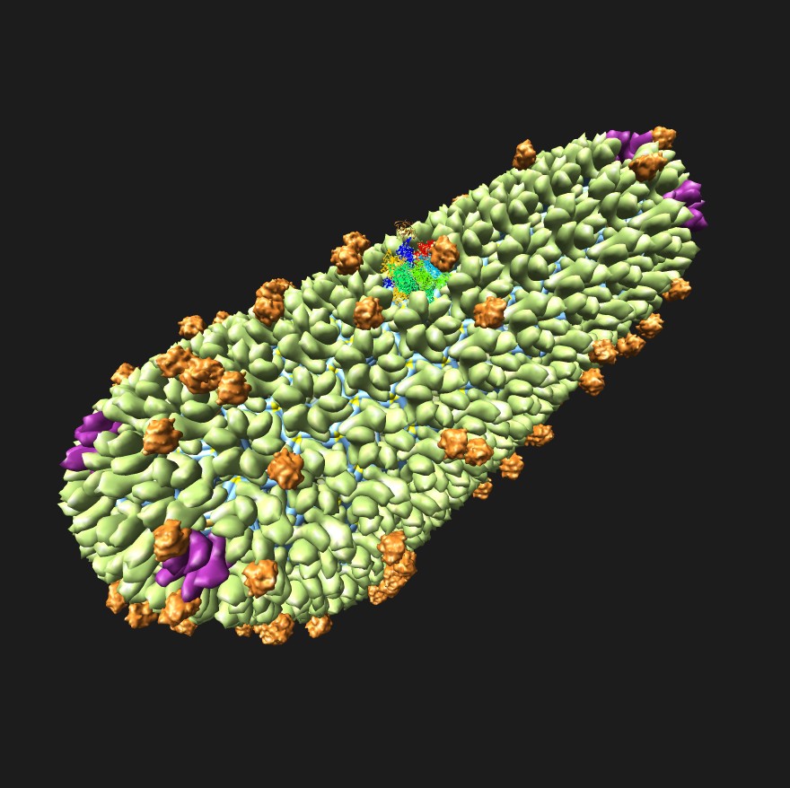 | Opening scene RNA wiggling. Clips P. | Fly over CD8 T-cell [1]. Clips P, D. | SIV virion with spikes between two cells. Clips P. | Core particle. Clips P. | HIV RNA dimer. Clips P, P2. | Ribosome size comparison (3u5b, 3u5d) [2]. Clips P, |