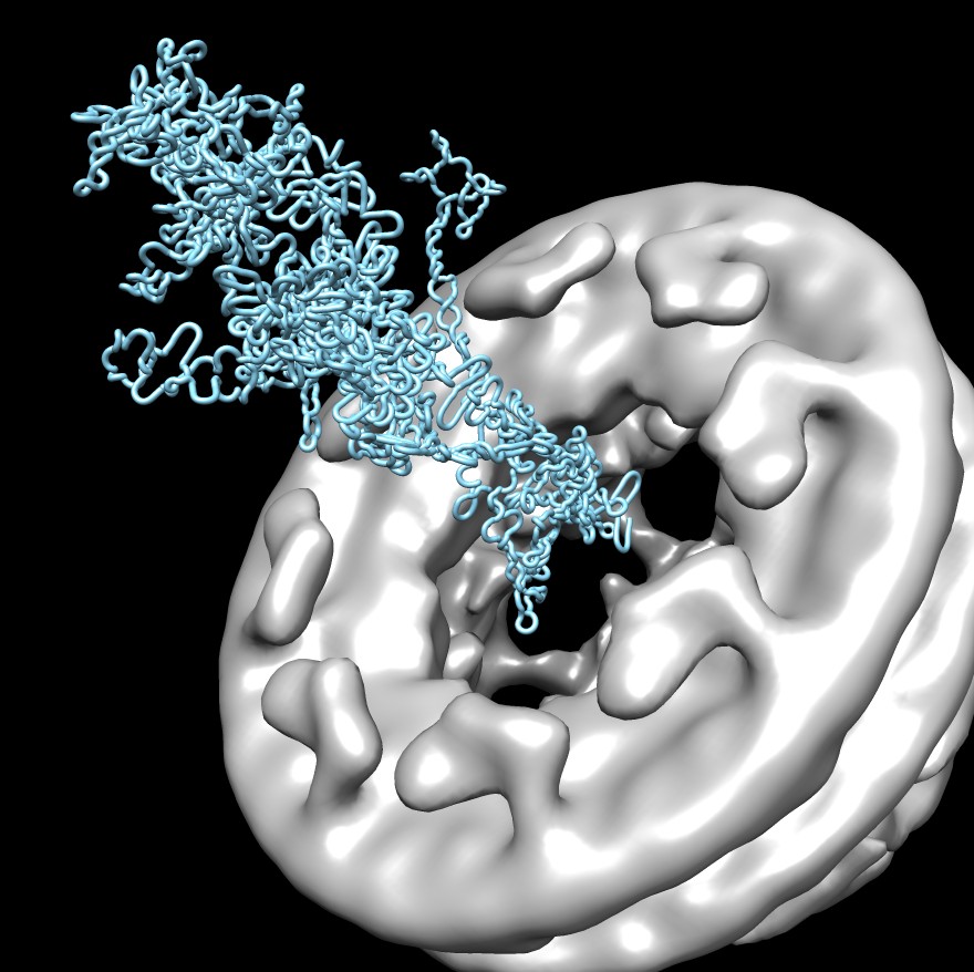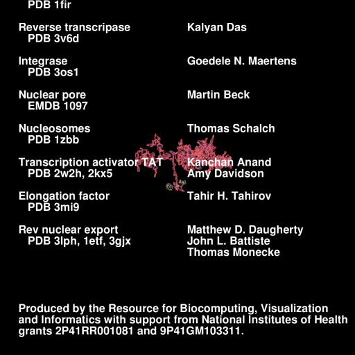 | Integrase binding (3os1). Clips P. | Nuclear pore (EMDB 1097), pre-integation complex must pass through. Clips P. | Chromatin with HIV integrated as 50 nucleosomes (1zbb). Clips P. | TAT binding (2w2h) at TAR RNA (2kx5) site recruits P-TEFb (3mi9) to get full length transcript. [3] Clips P. | Rev (3lph) binding to RNA (1etf) and CRM (3gjx) to export unspliced RNA from nucleus. Clips P. | Credits. Clips P. |