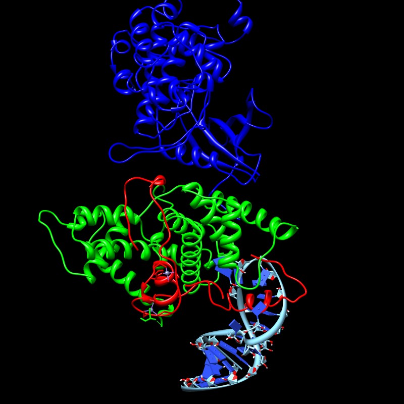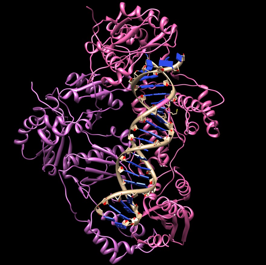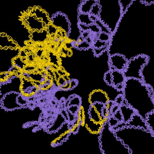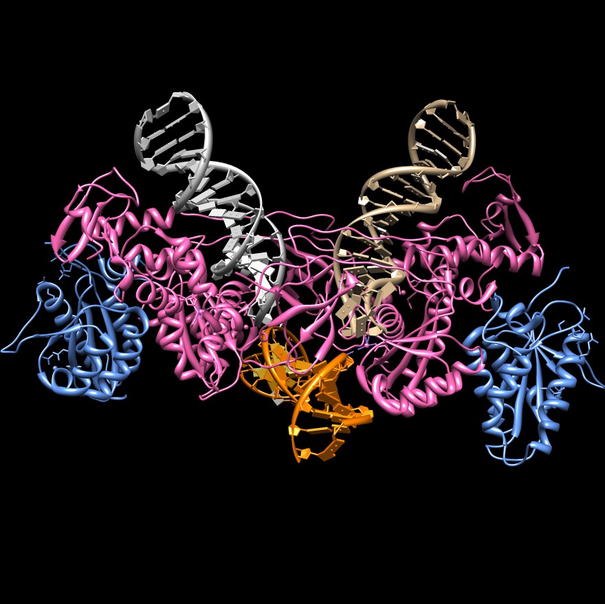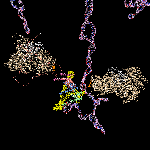 | tRNA primer (1fir) and reverse transcriptase (3v6d). Clips P. | DNA-RNA hybrid with RNA cleaved segments that fly away. Clips P. | Form and fly along duplex DNA. Clips P. | Circularized DNA with strand swap coloring. [5] Clips P. | |