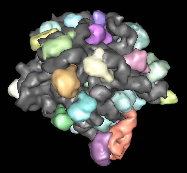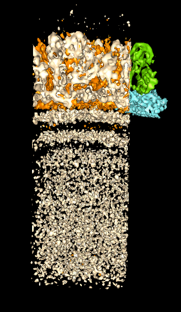 - Density map is hand segmented into layers, trimers, dimers and monomers.