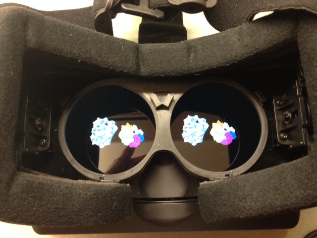 The Oculus gives a wide field of view (about 90 degrees) and stereoscopic depth, and tracks head orientation allowing you to look in all directions. Your vision is entirely filled with the virtual scene. This is significantly different from traditional stereo visualization on a desktop computer display or projector image because those technologies typically give a narrow field of view (typically 30 degrees), with no head tracking to allow viewing in other directions. The traditional methods show the molecules floating out in front of you and you cannot get to close to them because the line of sight from your eye to the molecule them misses the screen.