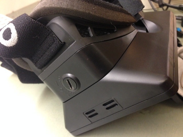 10) Motion blur. Objects appear blurry during motion because of the large pixel size combined with the effective motion when turning your head, for example turning at 200 degrees per second is 3 degrees per frame (60 Hz frame rate) which is about 1/30 of the approximately 90 degree field of view, or about 20 pixels of motion. The human vision system used without goggles compensates and you don't see blur, but with the Oculus the blurring (like a defocus) is noticeable. We have not tried anything to reduce this. But Oculus at the January 2014 Consumer Electronics Show demonstrated a new goggle prototype that flashes each image for a brief time (a few milliseconds?) instead of continuously illuminating during a 17 millisecond frame. This combined with higher screen resolution (believed to be 1920 x 1080) supposedly greatly reduced motion blurring. The new display was believed to be an OLED pentile display used in large Samsung phones (Galaxy Note) supposedly capable of 1 millisecond pixel rise times. Oculus does not say or even know if that technology will be used in their first consumer release.