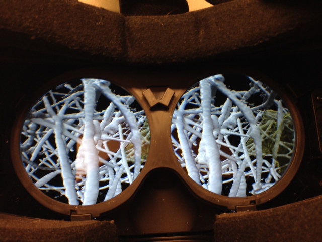 4) Chromatic aberration. Different frequencies of light refract at different angles through the lenses. It takes very expensive multilayer lenses to correct this chromatic aberration, and the Oculus is a cheap $300 device does not have these, so blue and orange color fringes are visible especially on gray or white objects in the periphery of the field of view. Oculus suggests you correct this in your GPU shader by warping the red and blue color channels differently so that the lenses will then merge the colors. Looking at a gray network of collagen filaments, the colors fringes were distracting so I added this refinement. It does not work perfectly because the red, green, and blue color components of a screen pixel are not at sharp frequencies but cover a large range of frequencies. So the correction actually introduces new small fringes in the center of view. But overall it was a very noticeable improvement.