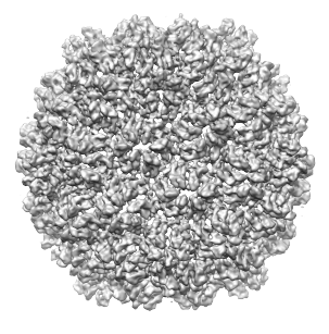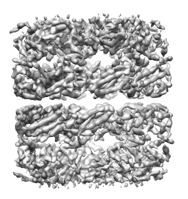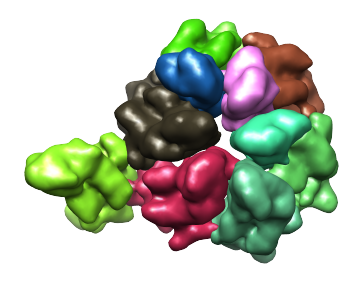 As can be seen above, there are 10 regions, however an ASU actually contains only 7 proteins. Thus, for some of the proteins, two regions correspond to each protein. If we tried to smooth further, to attempt to obtain a single region for each protein, regions from different proteins merge first. So for this map, when smoothing, a point can't be reached in which each region corresponds to a protein. This leads to having to deal with over-smoothing and/or multiple regions per protein.