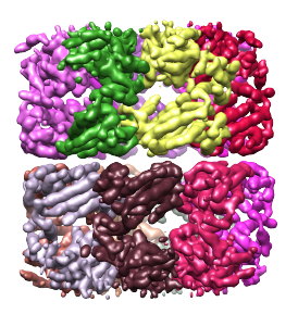 First, the density map must be segmented. Here we will use as an example the density map of GroEL at 4.2Å resolution. This map can be download from this link. When this map is segmented (as described on the segmentation page) at a threshold of 0.89, and the regions are grouped using 4 steps of size 7.5Å, 14 regions are obtained, with each region corresponding to a single protein. The density map and segmented regions are shown below.