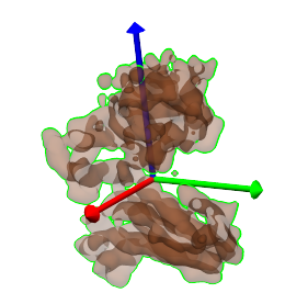 We can now align this structure to a segmented region in the density map. One way to do this is using the principal-axes transform. To see how this would work, select a single segmented region, and then select Regions->Show only selected, to show this region alone, then Regions->Make transparent to allow us to see through the region surface, and then Regions->Show axes for selected to show the principal axes for this region. The resulting view is shown in the image below.