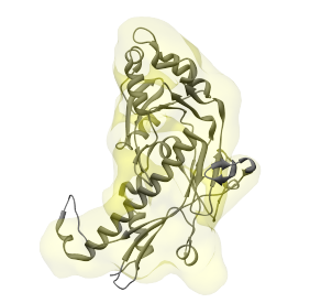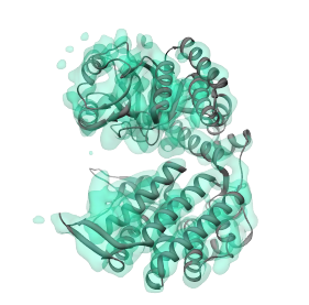 The density map will appear in the main Chimera window. Its name, 1xck_A_r4.2_sp1.1.mrc, will also appear in the drop-down menu to the right of the Structure density map button. This map can be manipulated like any other density map in the "Volume Viewer" interface. It can be hidden either through the Model Panel or Volume Viewer dialogs, so as to allow the structure to be seen; whether it is shown or hidden does not influence the steps to follow.