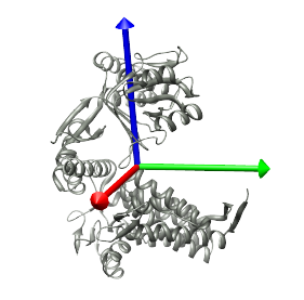 Once the structure of a single protein is selected in the drop-down menu to the right of the Structure button, first click the Center button to position this structure such that its center is at the origin, and its principal axes point along the X, Y, and Z axes. The principal axes can be shown by selecting Structure->Show Axes. The structure and axes are shown in the image below.