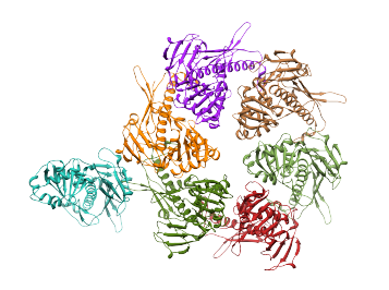 Then, the alignment of the strcture to every region can be accomplished by selecting Align to... ->Each selected region. This aligns the structure (and its simulated density map) to each of the regions that are selected, or ALL regions if none are selected. Since each region in this segmentation corresponds to a single protein, the structure is aligned successfuly to each one, reproducing the strcture of the entire complex, as shown below.