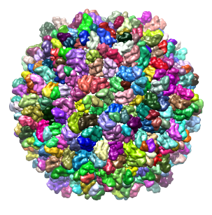 As another example, we will use the density map of bacteriophage lambda at 14.5Å resolution, which can be downloaded from this link. This map was segmented at a threshold of 3.5, and only 1 smoothing step of size 10.0Å was taken. Because this map is very large, taking more steps typically results in memory problems on 32-bit systems. After this grouping step, a total of 394 regions result. The density map and the segmented regions are shown below.